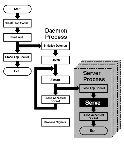 Ayrıca sunucu prosesin bu sokete ihtiyacıyoktur ve hemen kapatmalıdır. Benzer şekilde daemonun da accept edilen sokete ihtiyacı yoktur ve kesinlikle kapatmalıdır. Kapatmazsa yakın zamanda ya da daha sonra mevcut dosya tanımlayıcısıkalmayacaktır.