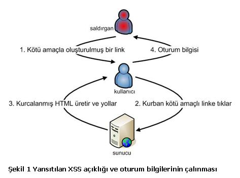 3 çeşit xss vardır ve bunlardan ikisi Şekil 1 ve Şekil 2 de gösterildiği gibi oturum korsanlığı saldırılarında kullanılabilir. (Şekillerde “sunucu”ların, xss açıklığından muzdarip bir web uygulama barındırdığı kabul edilir.)
