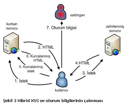 Hibrid XSS açıklığının kullanıldığı (Şekil 3) oturum korsanlığı saldırısındaki bileşenler şu şekilde listelenebilir;